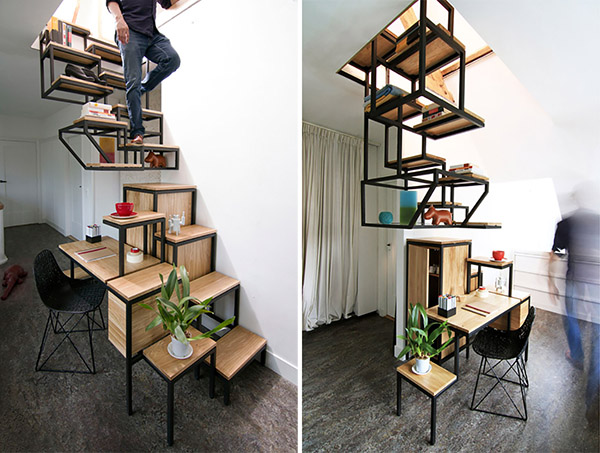 荷蘭設(shè)計(jì)師Mieke Meijer打造了一個(gè)具有儲(chǔ)物功能的樓梯。這個(gè)樓梯分兩個(gè)部分,上部高低兩排的懸浮鏤空結(jié)構(gòu)使其在具備儲(chǔ)物功能的同時(shí)也方便行走,而下部由儲(chǔ)物柜和辦公桌組成。這樣的設(shè)計(jì)方式在考慮樓梯自身功能的同時(shí),也有效的利用了空間。