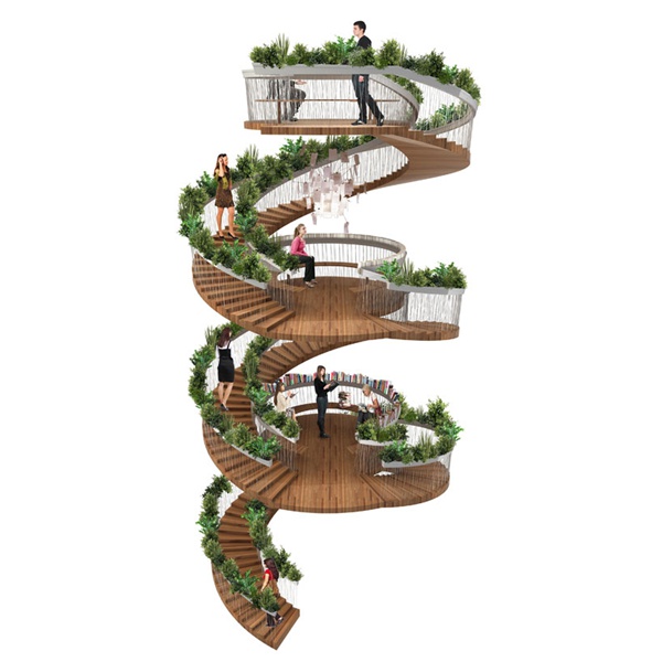 樓梯不僅僅是個(gè)過渡區(qū)域,還可以兼?zhèn)淦渌δ?,比如空中花園。在倫敦的一處辦公區(qū)域里,設(shè)計(jì)師把承重柱在中間的傳統(tǒng)樓梯變成螺旋結(jié)構(gòu)的The Living Staircase,沿著欄桿種滿植物,還設(shè)有圓形平臺,成為可以讓上班族在此休息放松的公共區(qū)域。設(shè)計(jì)源自 Paul Cocksedge Studio。